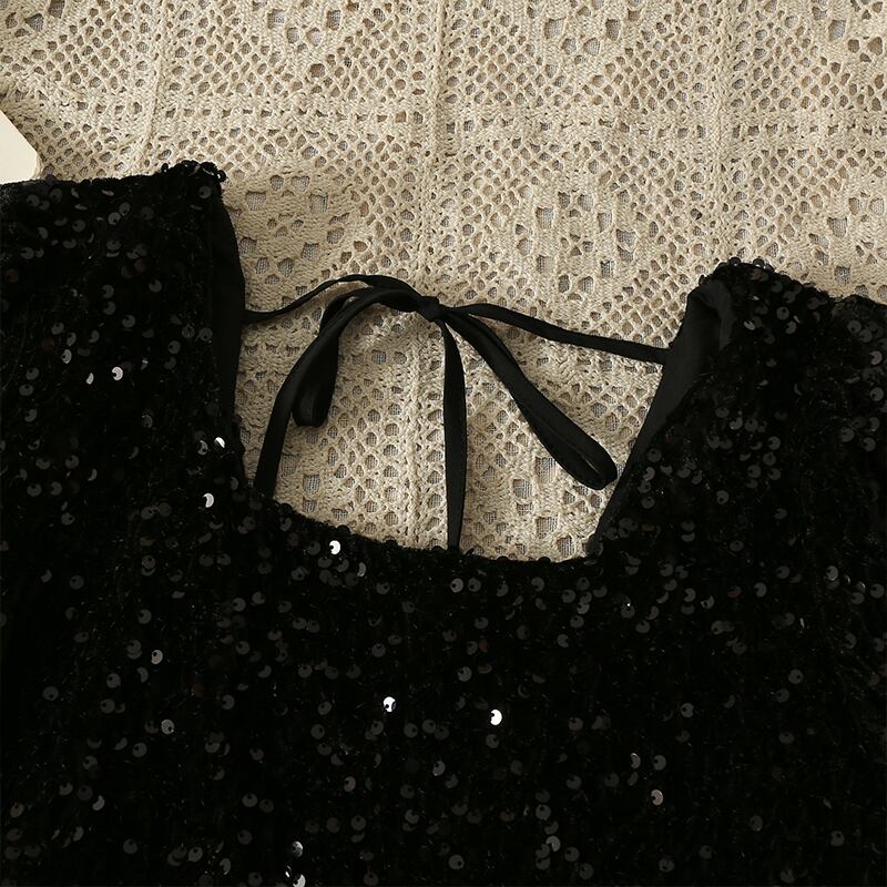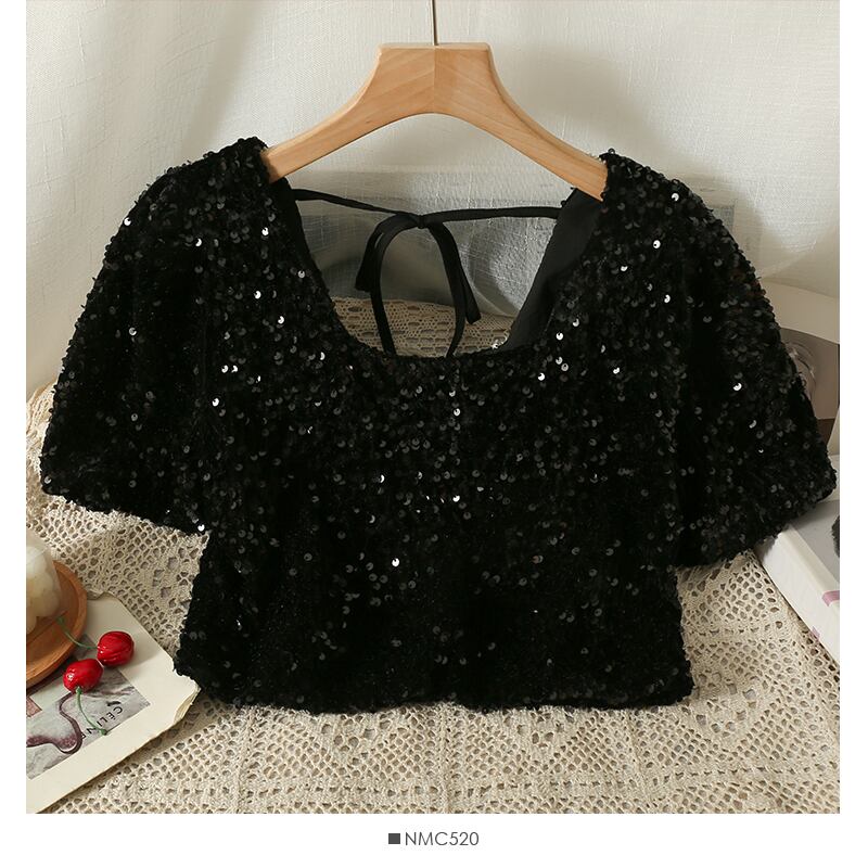美的グランジグラフィック Tシャツ夏クロップトップススクエアパフ半袖黒スパンコール Tシャツ ショート ブラック ハーフスリーブ サマー 夏物 スクウェア