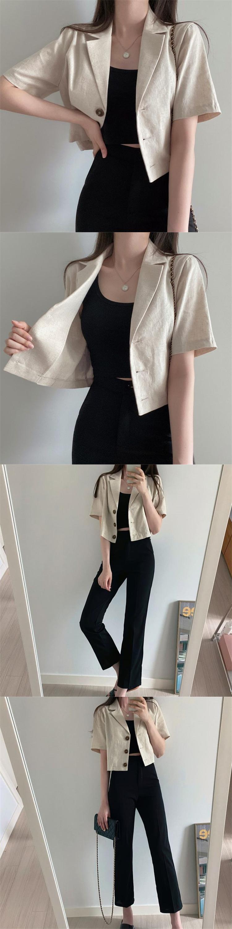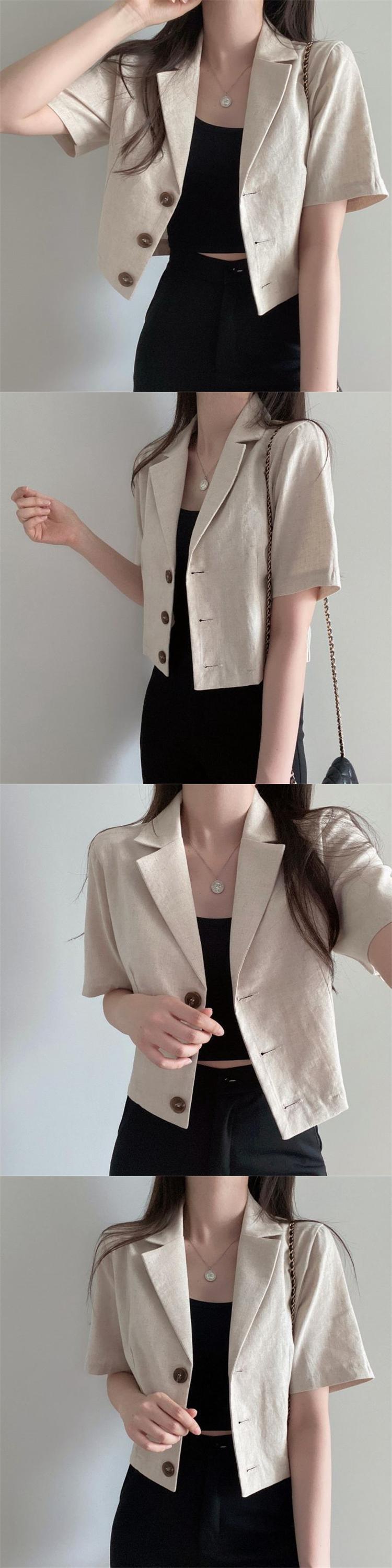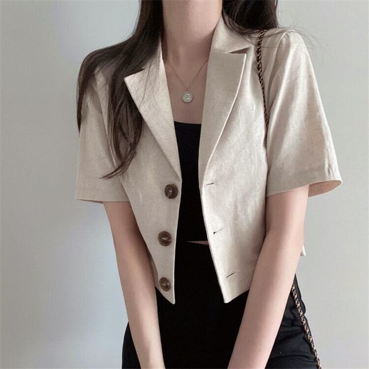 ノッチコットンとリネンジャケット夏半袖クロップドブレザーソリッドブラックブレザーフェミニノコートオフィスレディ ショート ハーフスリーブ サマー 夏物 ソリッドカラー 会社 学校 通勤や通学にも
