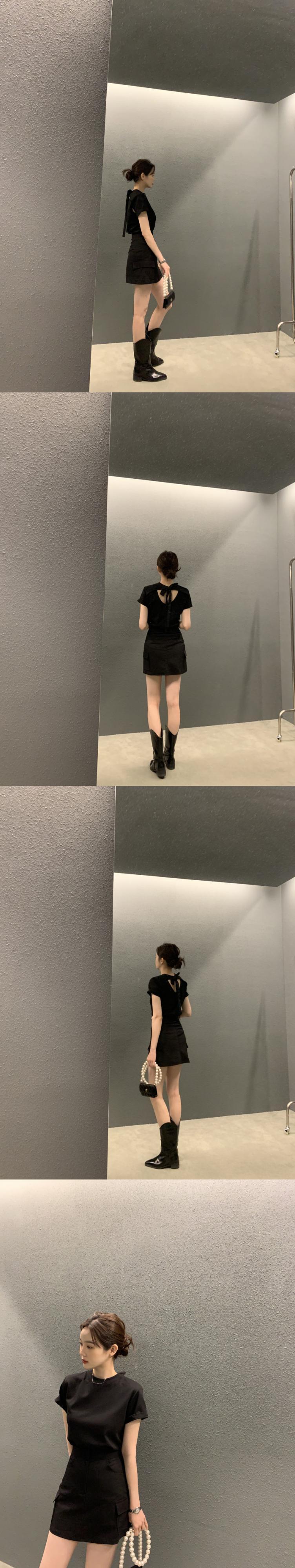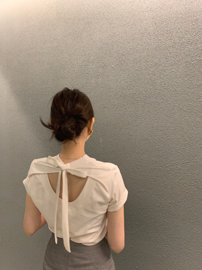 O ネックオープンバック中空ネクタイちょう結び Tシャツシック夏ルーズホワイト半袖 Tシャツトップスクロップトップ ショート リボン ハーフスリーブ サマー 夏物 Oネック