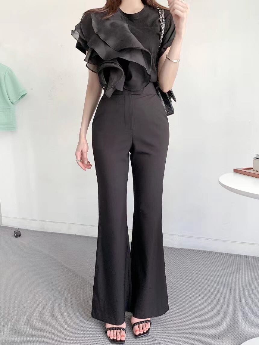 夏フレンチスタイルラウンドネックフリルルーズ多彩半袖 Tシャツ黒美的服グラフィック Tシャツトップス ショート ブラック ハーフスリーブ サマー 夏物 Oネック