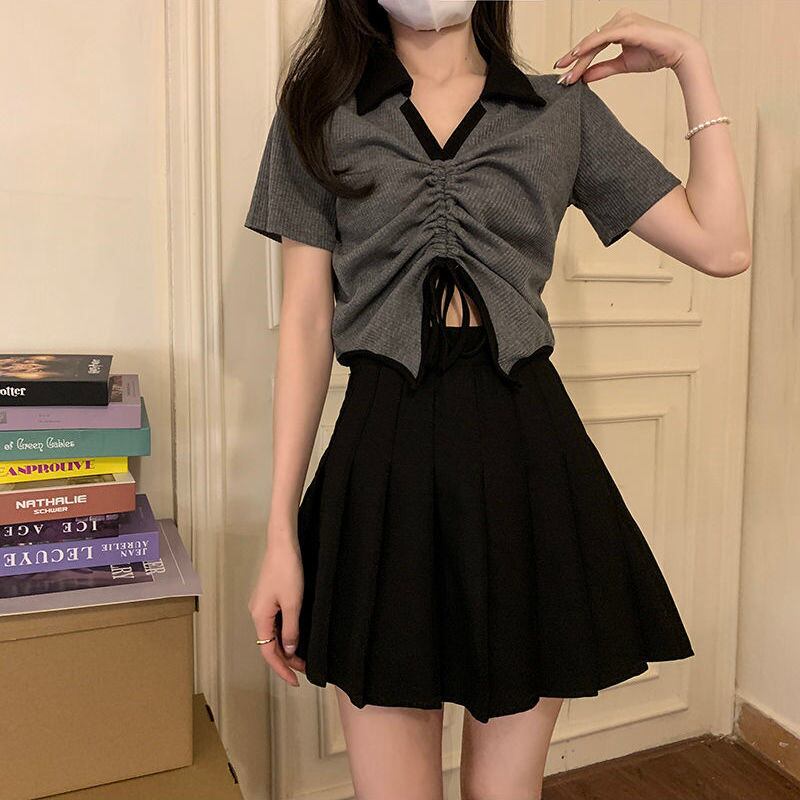 コントラストラペル不規則プリーツ巾着トップセクシー Y2k グランジ Ropa 美的服半袖グラフィック T シャツニット ショート ハーフスリーブ Tシャツ