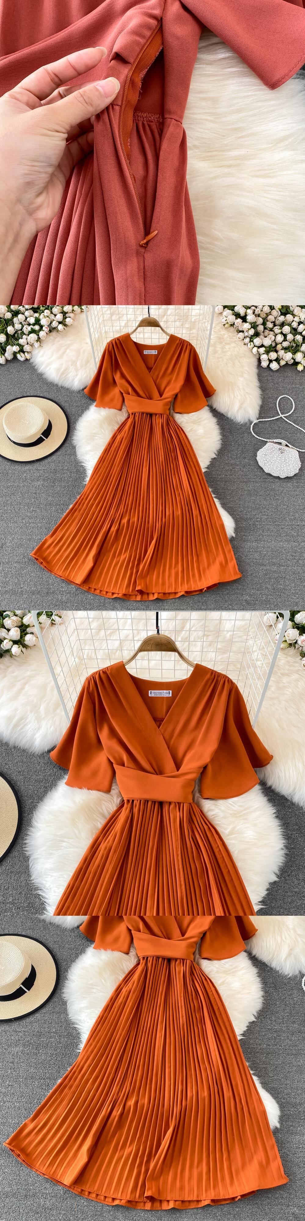 夏 V ネック半袖ドレススリムレースアップ大き裾プリーツドレスワイルドローブロングシフォン Vestidos ビーチドレス ショート ハーフスリーブ サマー 夏物 Vネック