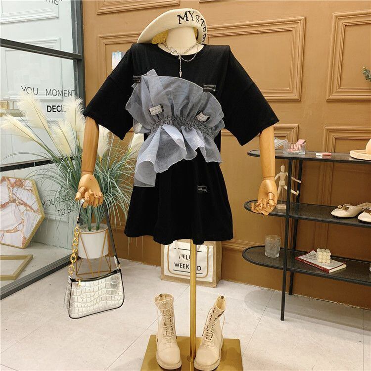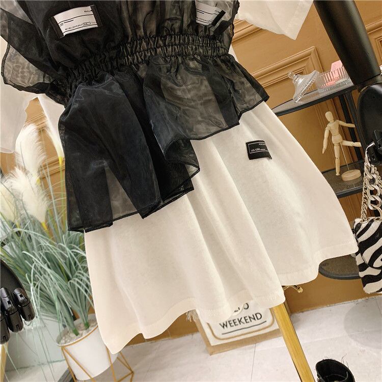 非対称メッシュパッチワークフェイク 2 ピース Tシャツ O ネックプルオーバー半袖 Tシャツ夏綿トップ Y2k ショート コットン ハーフスリーブ サマー 夏物 Oネック
