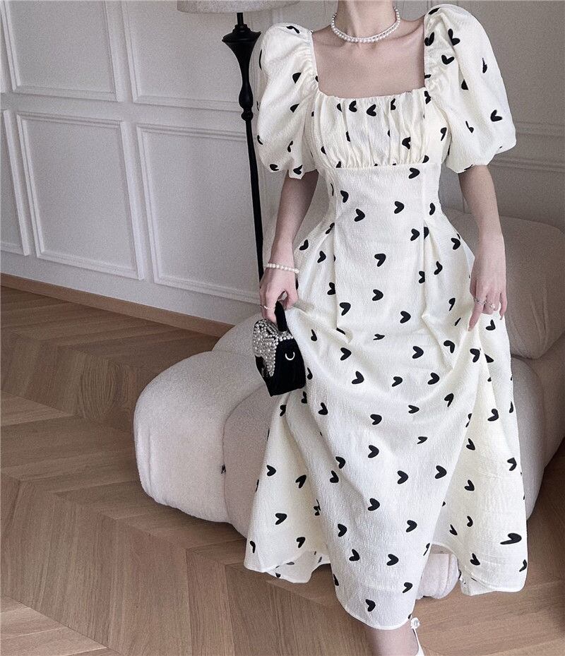 Vestidos フレンチスクエア背中開いた愛ドレスパフ半袖ちょう結びルーズ春夏レトロシック ショート リボン ハーフスリーブ スプリング 春物 サマー 夏物 スクウェア