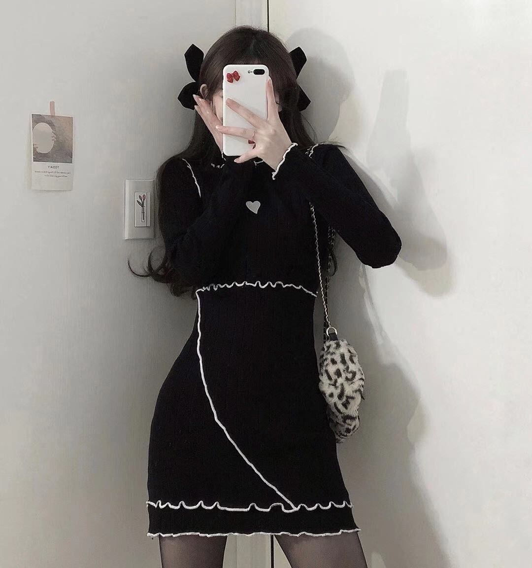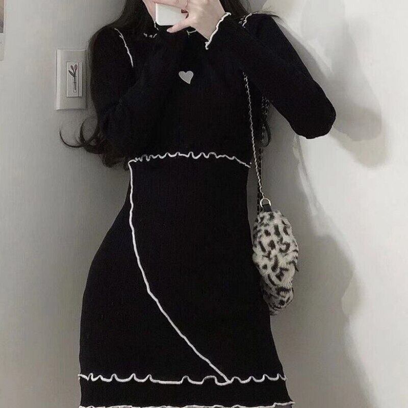 ローブ ese 甘い女子真菌スリム A ラインワイルドウエストミニ黒ニットドレスボディコン Vestidos セータードレススリーブ ブラック 大人ガーリー スウィート キュート カジュアル Aライン