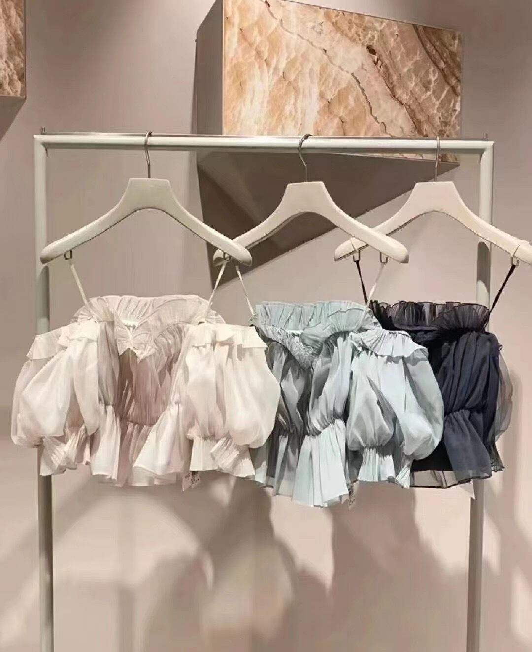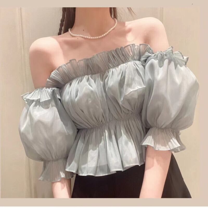 ese シフォンスラッシュネックブラウスフリルオフショルダーセクシーシャツショートフレッシュソリッドカラーシャツ