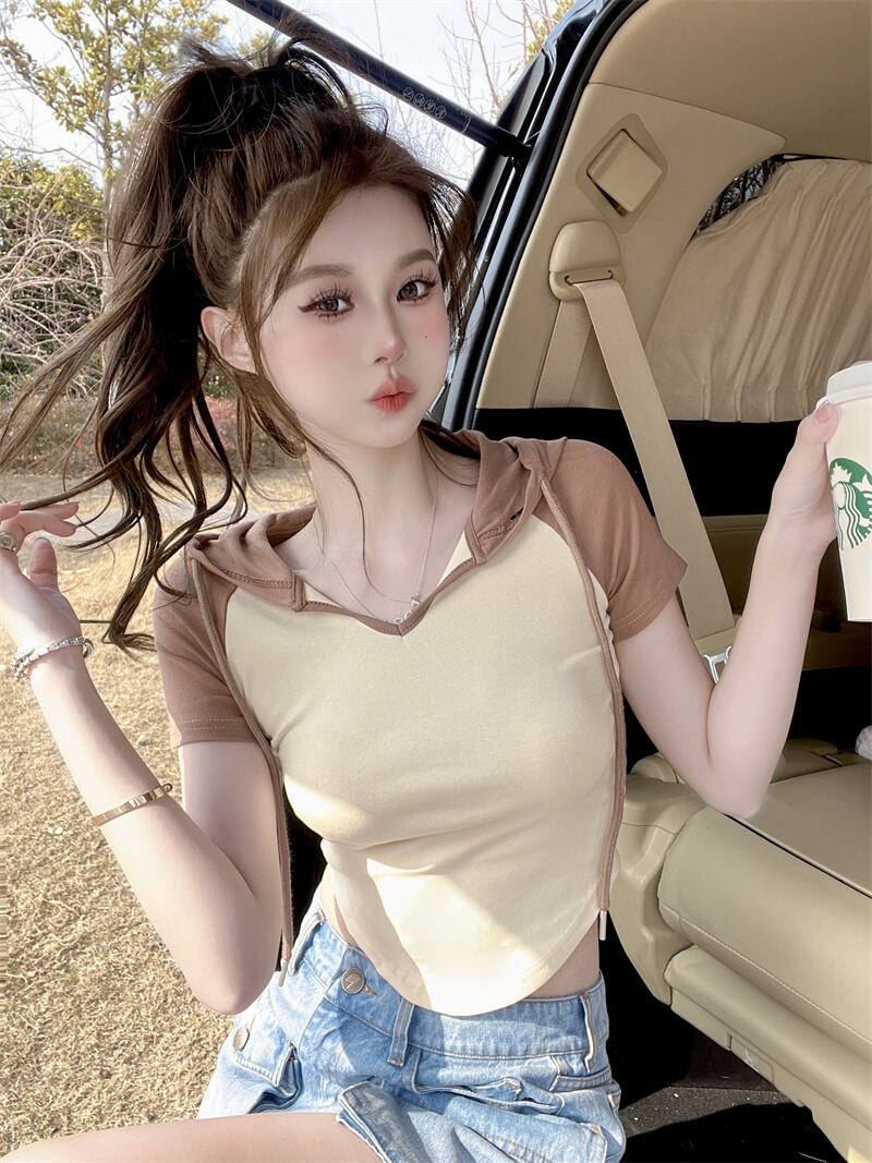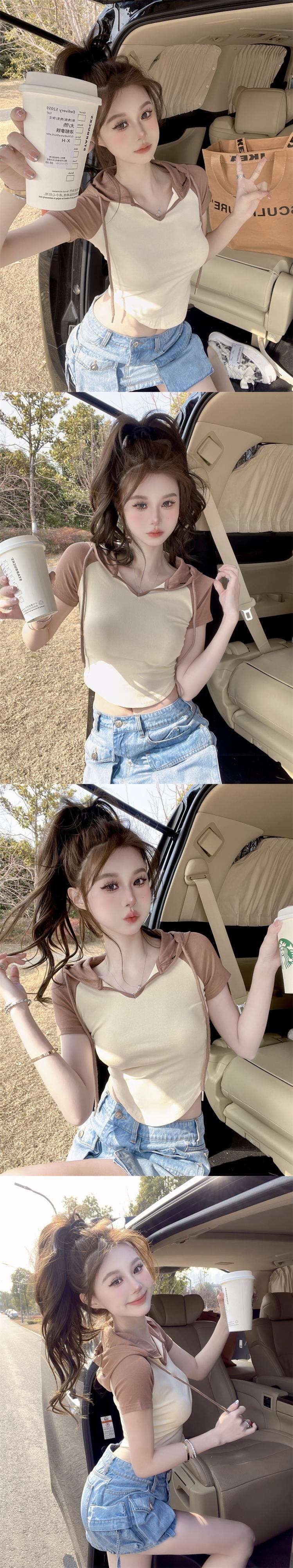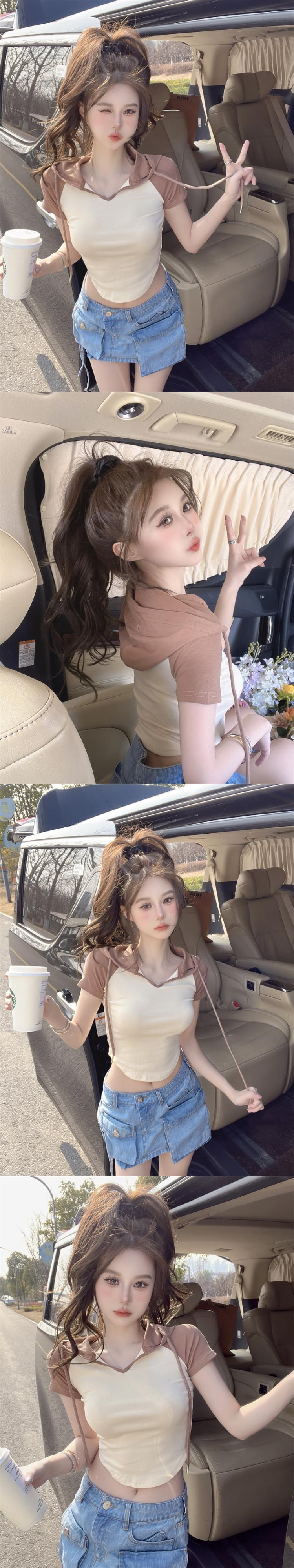 グラフィック Tシャツ美的服 Y2k トップグランジ半袖フード付き Tシャツ不規則カラーコントラスト Tシャツ夏作物 ショート ハーフスリーブ サマー 夏物