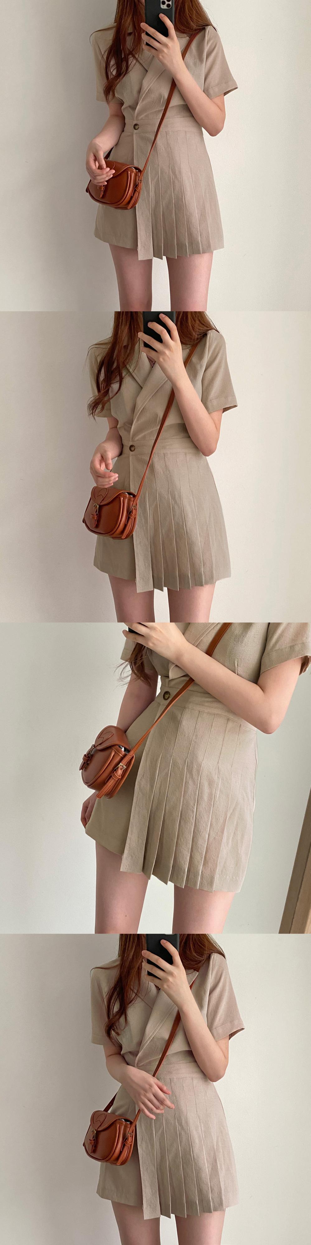 シック夏シンプルレトロシングルボタンノッチカーキ半袖プリーツドレスミニ黒ショーツワイルド ショート ブラック ハーフスリーブ サマー 夏物 ブルマー