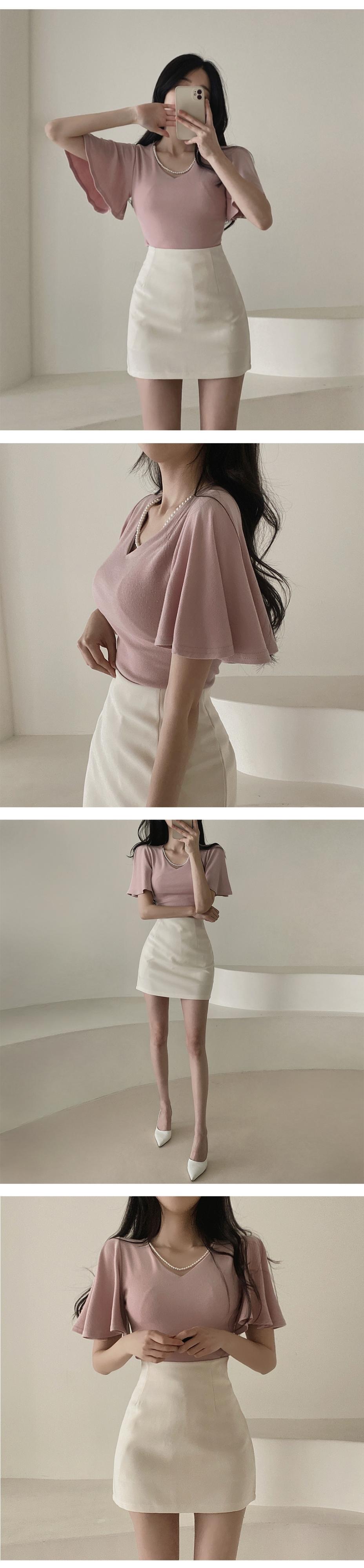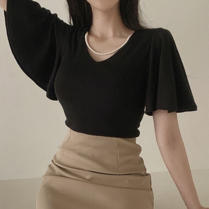 シャツ気質 V ネックフレア半袖トップスリムフィット作物 Ropa ピンク Tシャツフリル Tシャツ ショート ハーフスリーブ Vネック