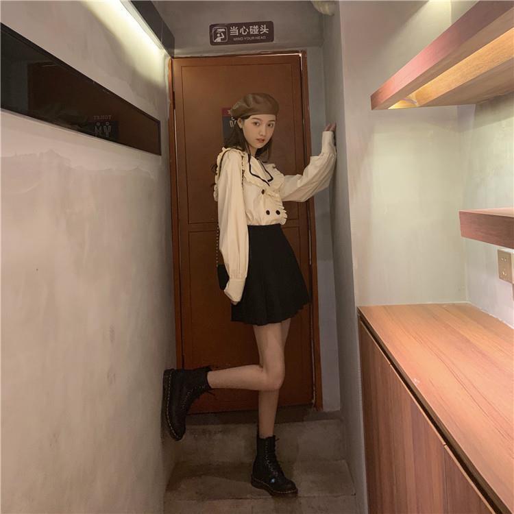 シックセーラー襟トップスカミーサルーズブラウスブルーサフリルダブルブレストシャツ人形甘い春 大人ガーリー スウィート キュート カジュアル スプリング 春物