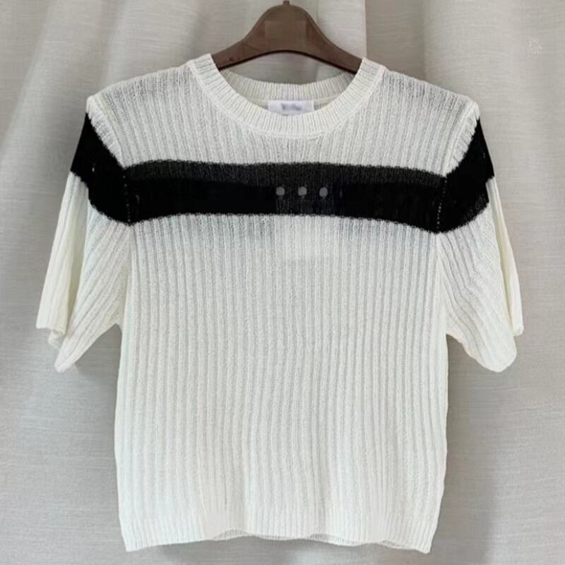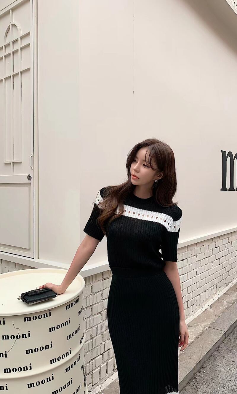 カラーマッチングニットスーツ O ネック半袖多彩プルオーバーウエストシースロングスカートセット夏 2 トップス ショート ハーフスリーブ サマー 夏物 Oネック