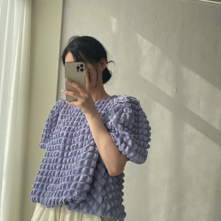 O ネックパフ半袖夏ソリッドシンプルブラウスシック 3D バブルチェック柄シャツトップス T シャツ ショート ハーフスリーブ サマー 夏物 Oネック Tシャツ ソリッドカラー