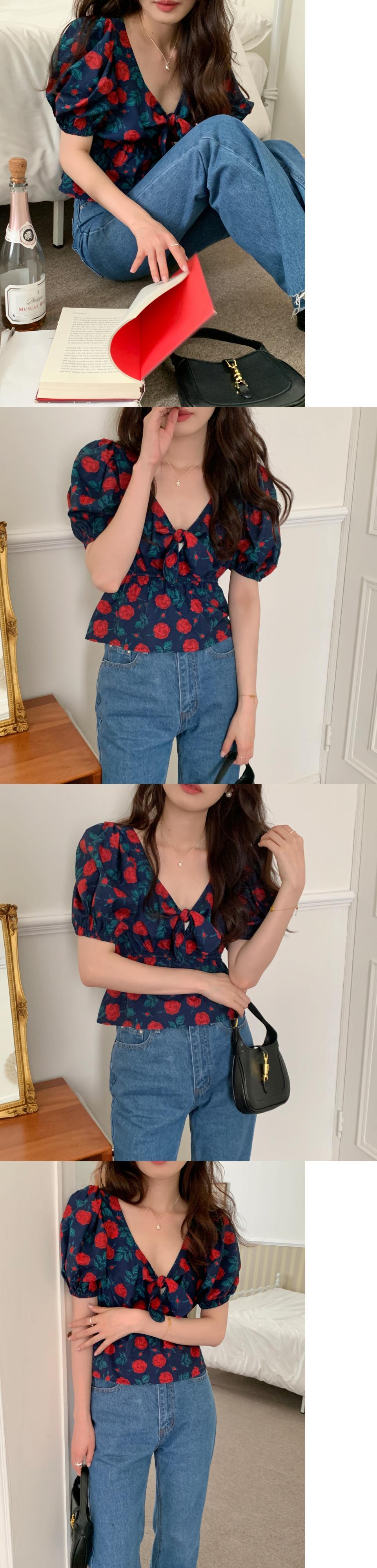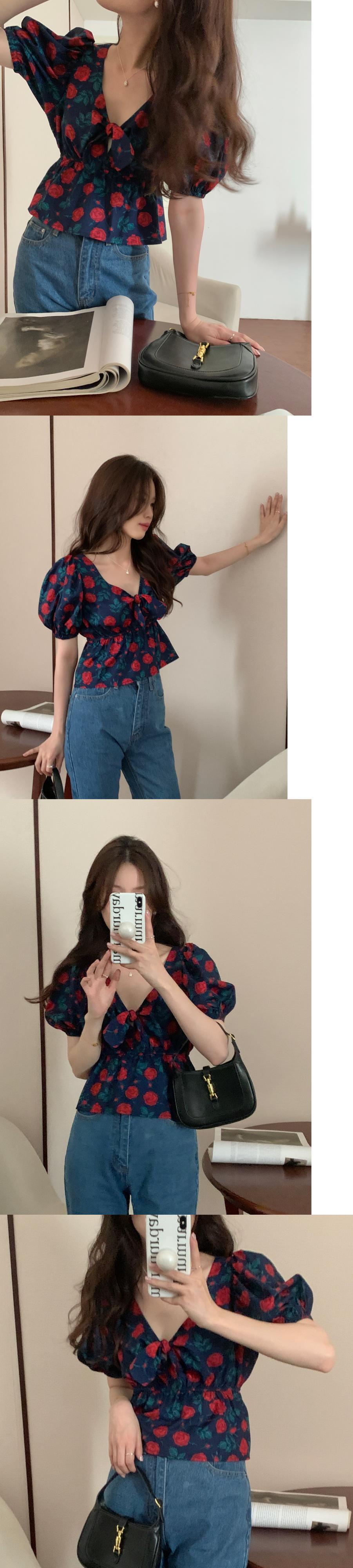 セクシークロップトップス V ネックレースアップ中空黒ローズシャツプリントバブル半袖シャツスリムブラウス ショート ブラック ハーフスリーブ Vネック