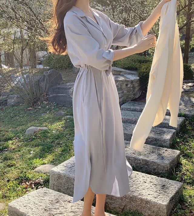 ワイルドラペル気質ミニマリストシングルブレストレースアップウエストシャツドレスノッチ A ライン Vestidos ローブフル Aライン