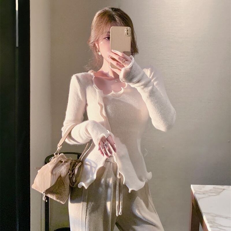 プルオーバーセーター長袖黒シャツスリムセータージャンパー不規則分割真菌ニットセータートップス ロング ブラック