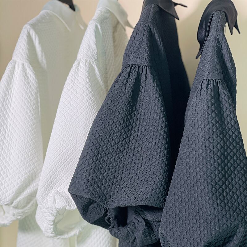 Y2k ミニマリズム気質ラペル襟ルーズランタン半袖ブラウストップスシャツ白チェック柄 ショート ホワイト ハーフスリーブ