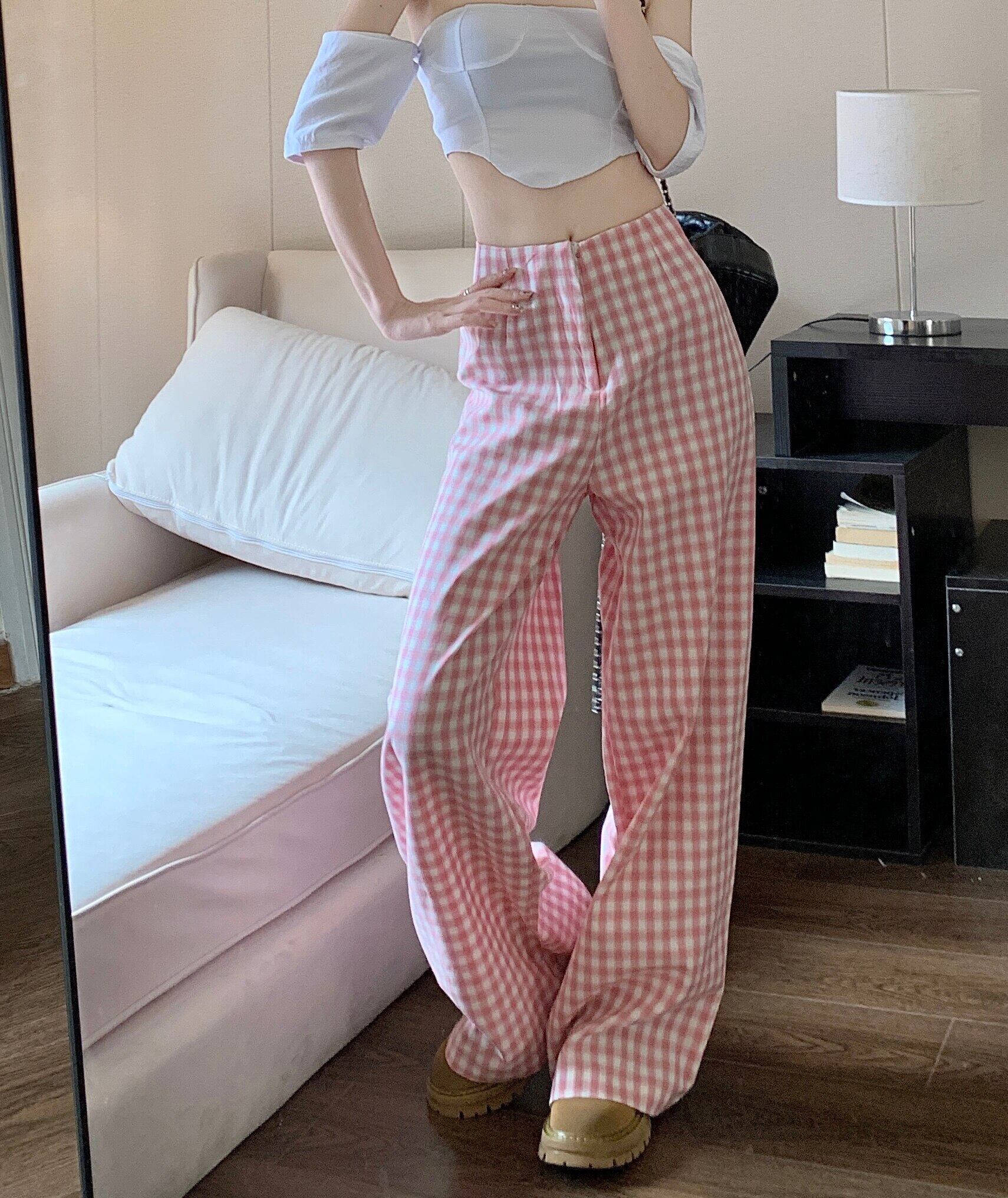 ルーズストレートレッグワイドウエストピンクチェック柄パンツ Y2k パンタロンデカーゴスウェットパンツズボンストリート