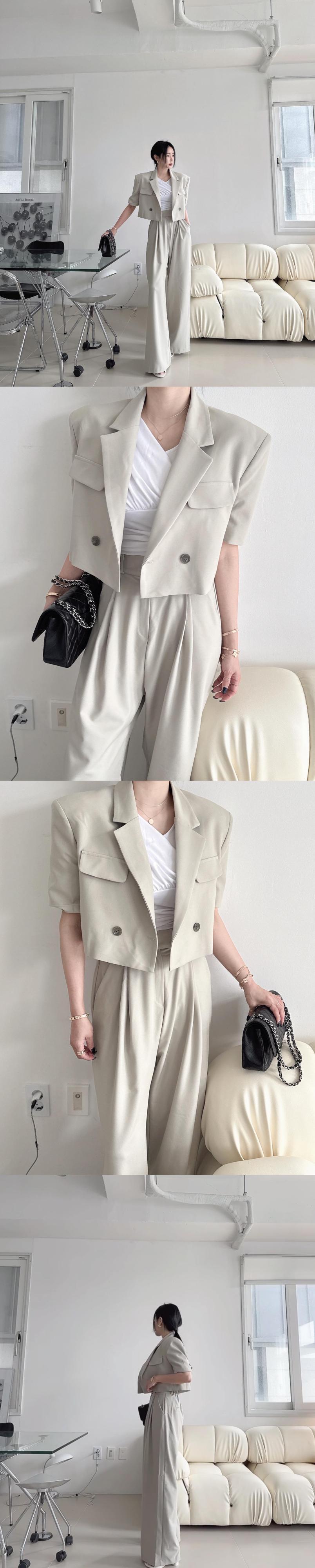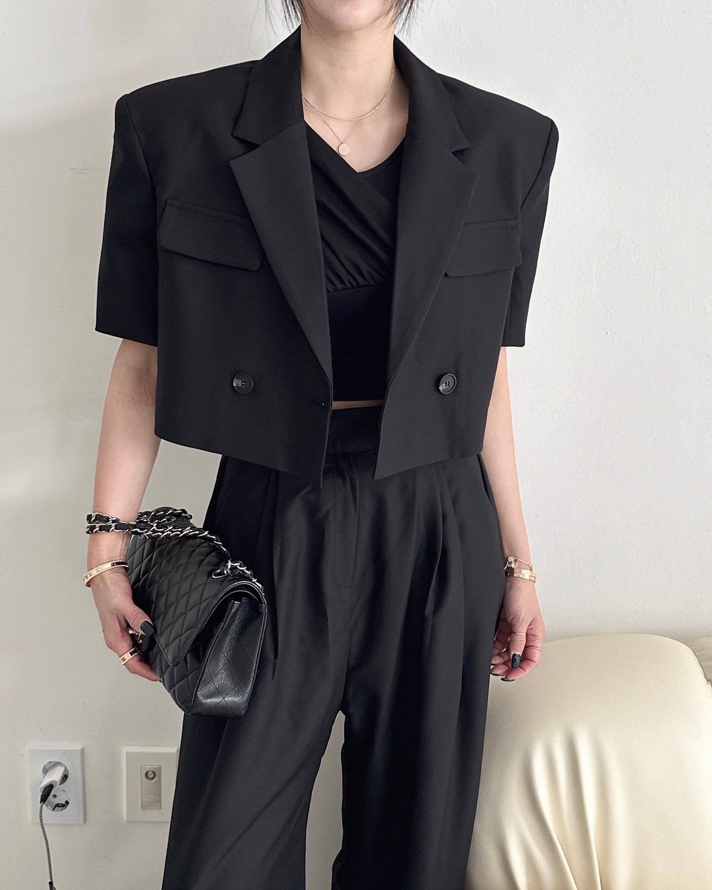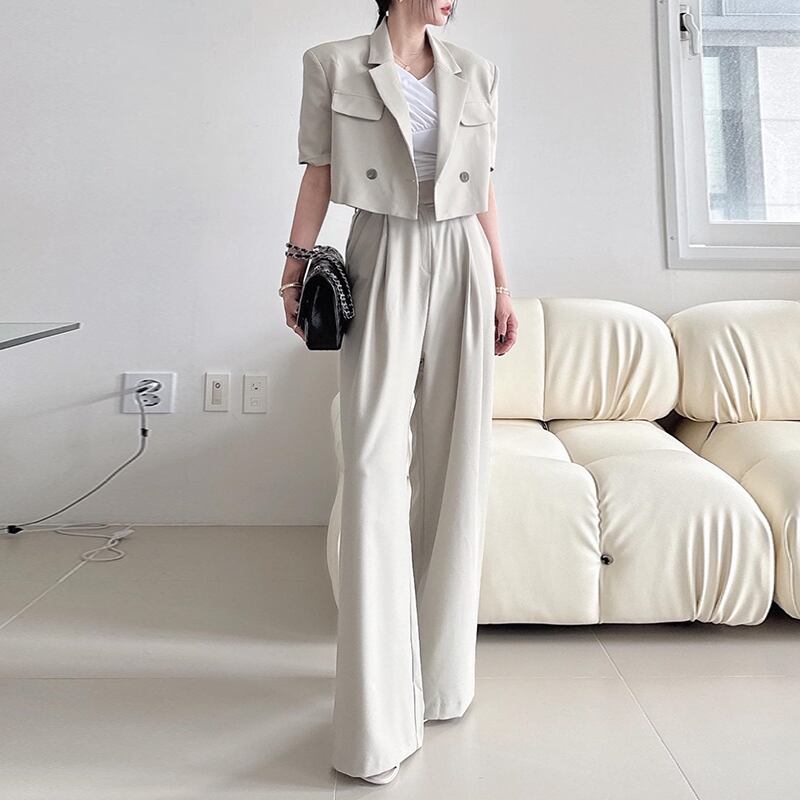 ワイドレッグブラックテーラードパンツレトロノッチ半袖ブレザーブレザーセットパンツスーツY2kサマージャケットコート ショート レッド ハーフスリーブ 夏物 ワイドパンツ