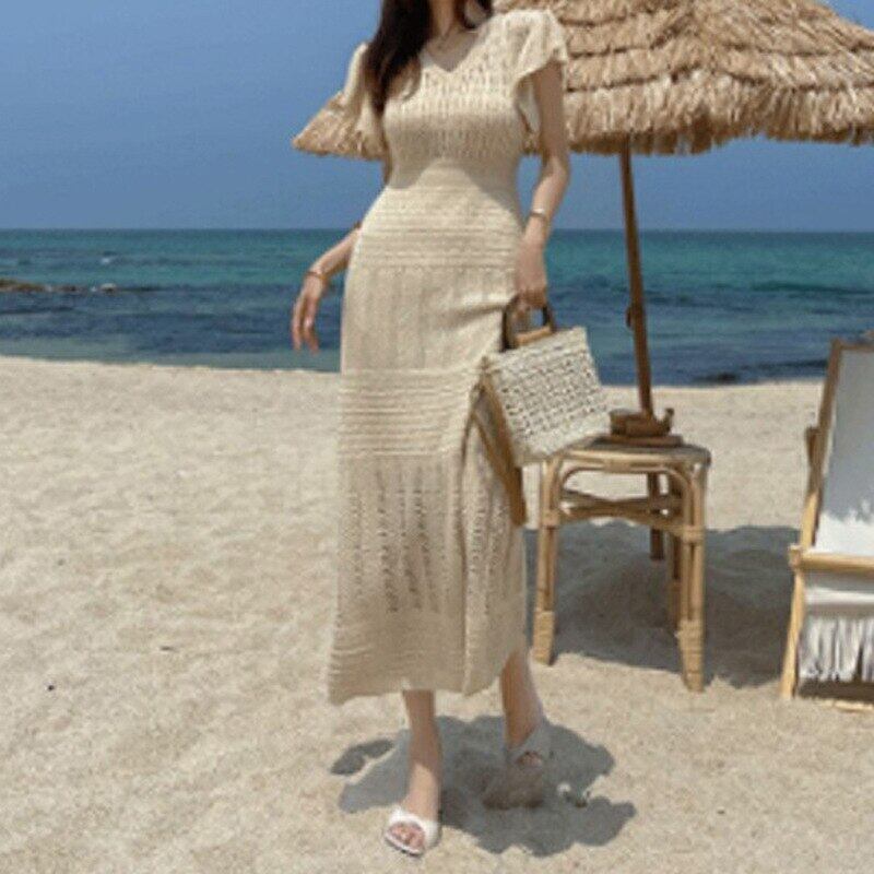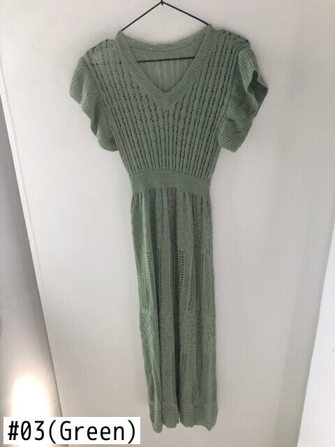 気質カットアウト V ソリッド半袖ニットドレスかぎ針編み A ラインドレスフライングフリルロングドレス ショート ハーフスリーブ Aライン ソリッドカラー