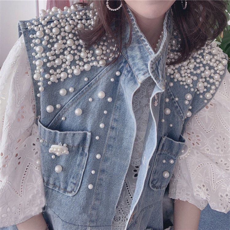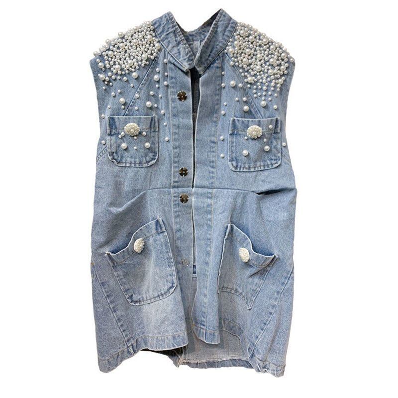 スタンドカラー ジーンズ ジャケット センス ビーズ デニム ベスト コート Jaqueta Y2k チョッキ 美学 グランジ カーディガン