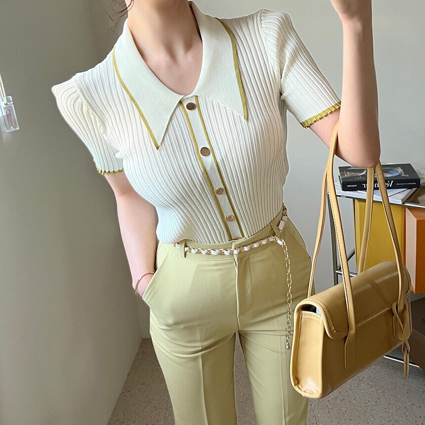 ピーターパン襟半袖ニット Tシャツプル Y2k トッププルオーバーセータージャンパー感覚ニットウェアセーター ショート ハーフスリーブ