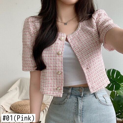 シャツ ツイード半袖コート トップス レディース シングルブレスト ピンク チェック柄 カーディガン ビーズ クロップ ジャケット 夏 Y2k ショート ハーフスリーブ サマー 夏物