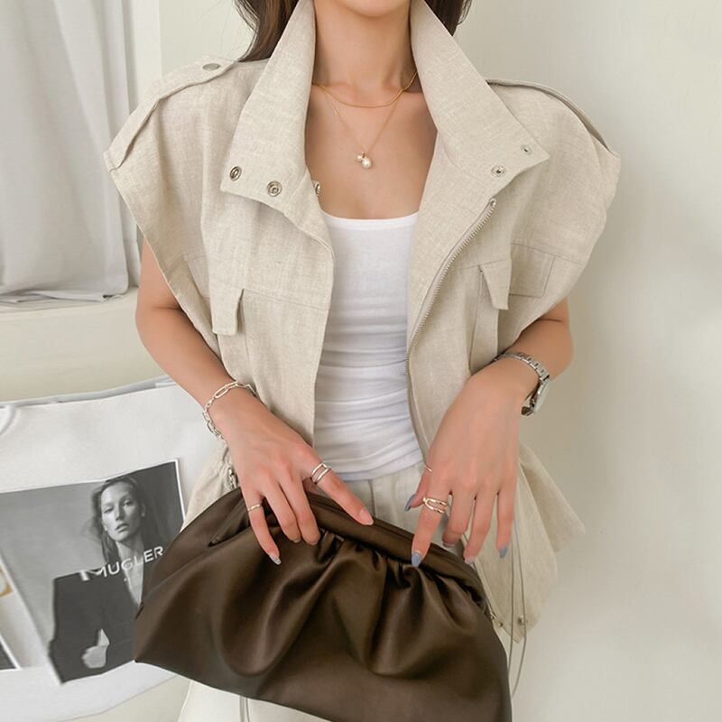 Colete Feminino 巾着ウエストノースリーブジャケットカーゴ Chaquetas スタンドチョッキベスト Chaleco ジッパー