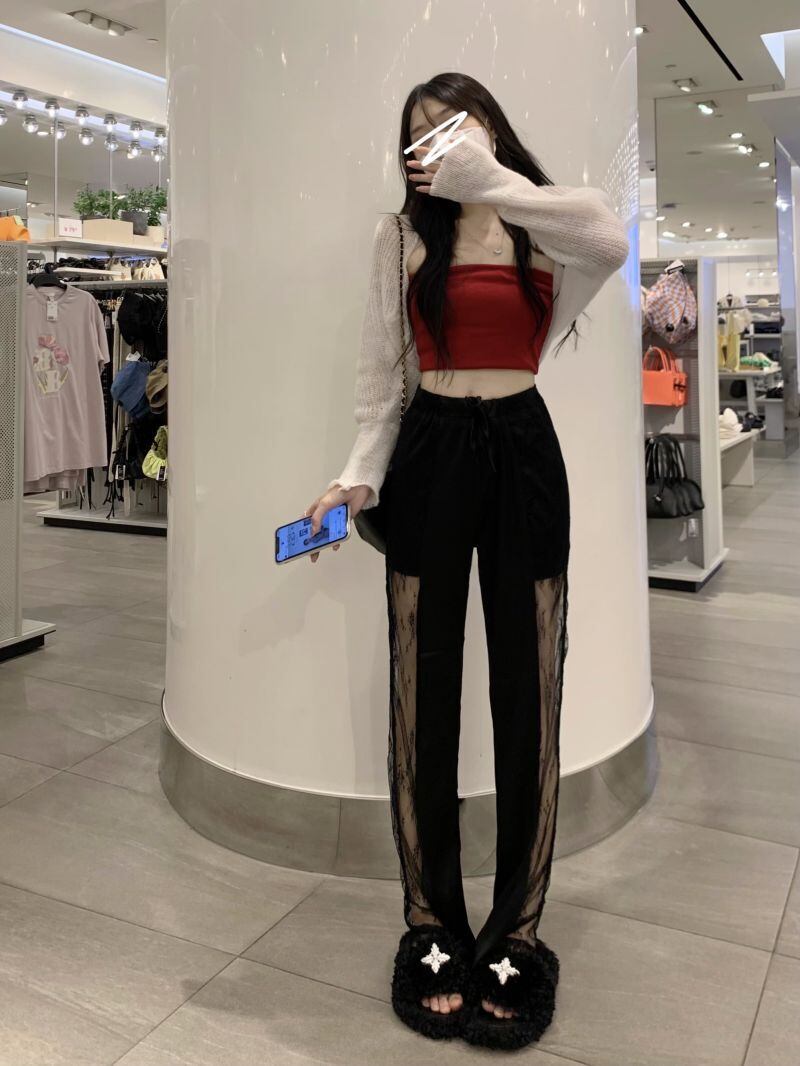 スウェットパンツストリートズボンストレートワイドレッグブラックレースパンツ Ropa Y2k スリムフレア弓視点 リボン ワイドパンツ