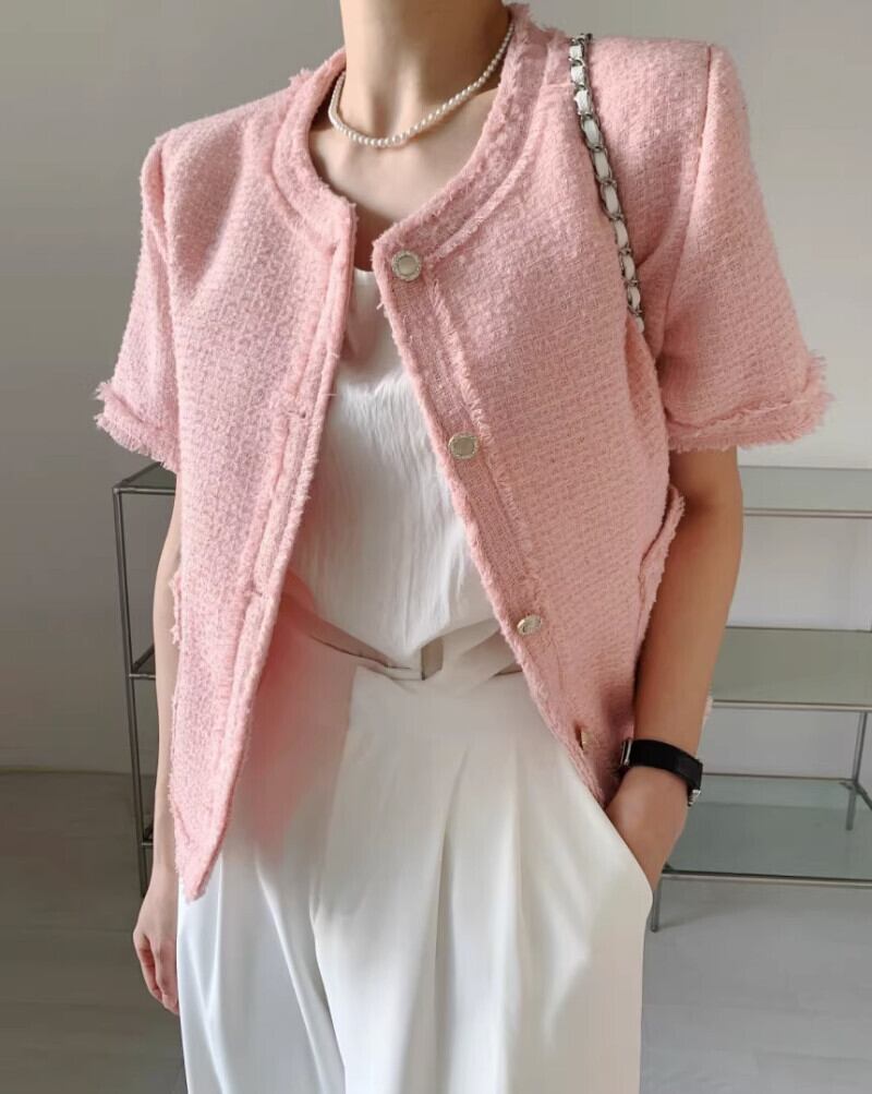テーラードコートセンス半袖カーディガンピンクテルジャケット Jaqueta チェック柄コート服 ショート レッド ハーフスリーブ