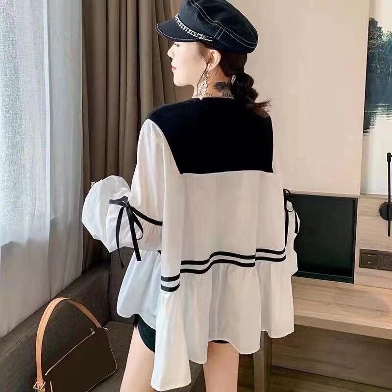 ストライプステッチプルオーバールーズ長袖 Tシャツ春秋トップ美的服レディースシャツ ロング スプリング 春物 オータム 秋物