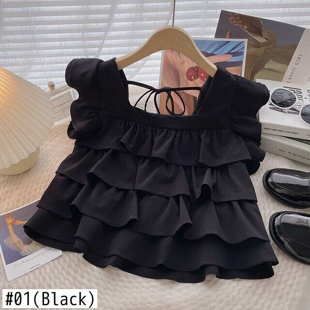 タンクトップキャミソールクロップスリム二重層フリルシャツレースアップブラウスワイルドブラックホワイトフライスリーブスクエア Tシャツ スクウェア