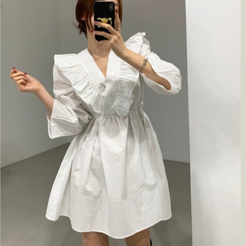 V ネックフリルサイドストラップウエスト長袖 Vestidos ミニドレスセクシーブラックホワイトフレア ロング Vネック