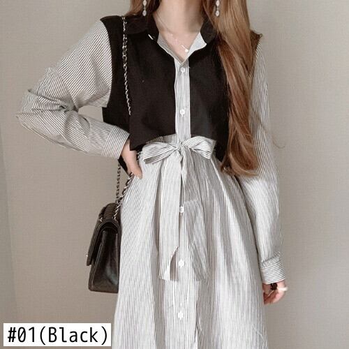ラペル襟コントラスト偽ツーピースシャツストライプドレス Vestidos デ包帯ウエスト Y2k ドレスプレッピー