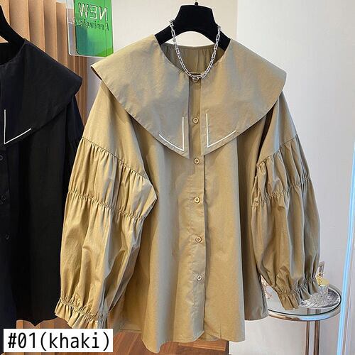 ルーズホワイトブラウスドールカラーシャツ春ランタンスリーブラペルシャツカーキトップスシック スプリング 春物