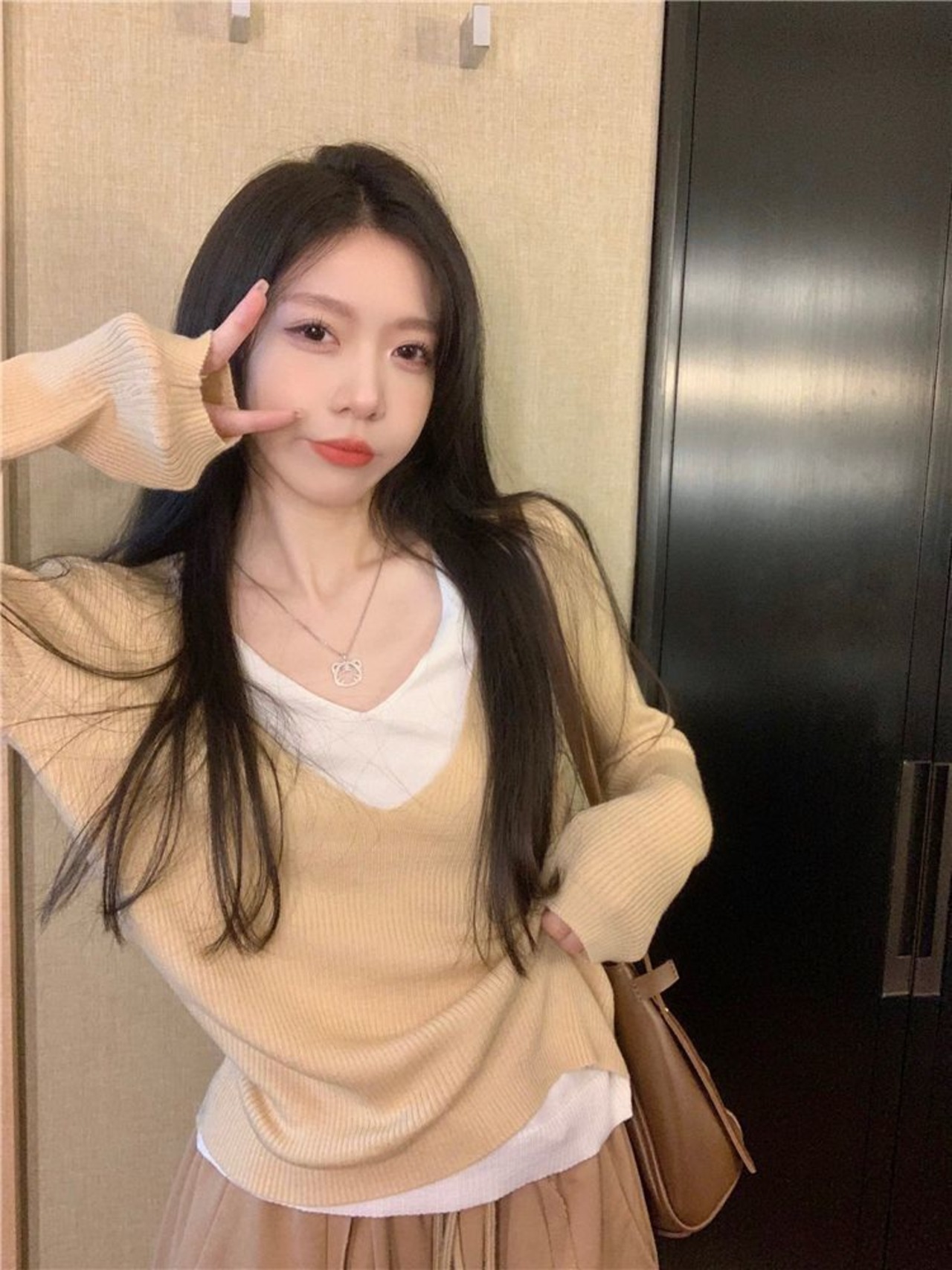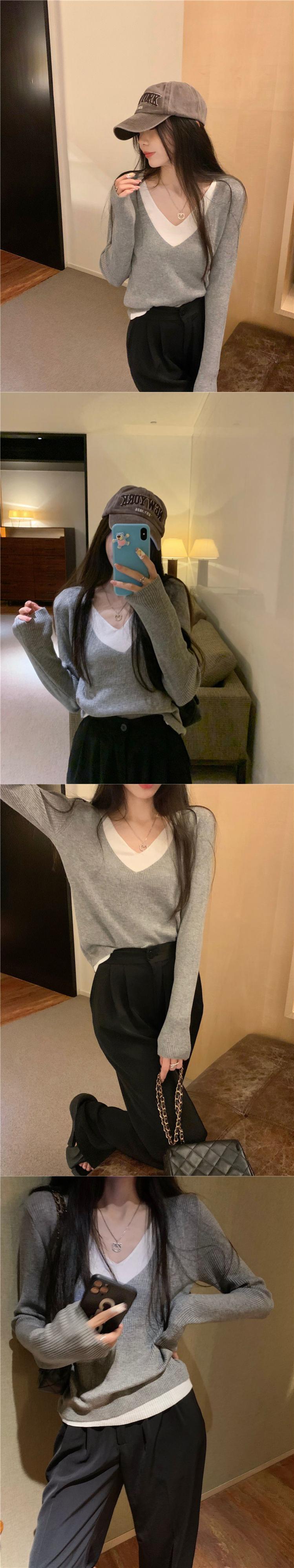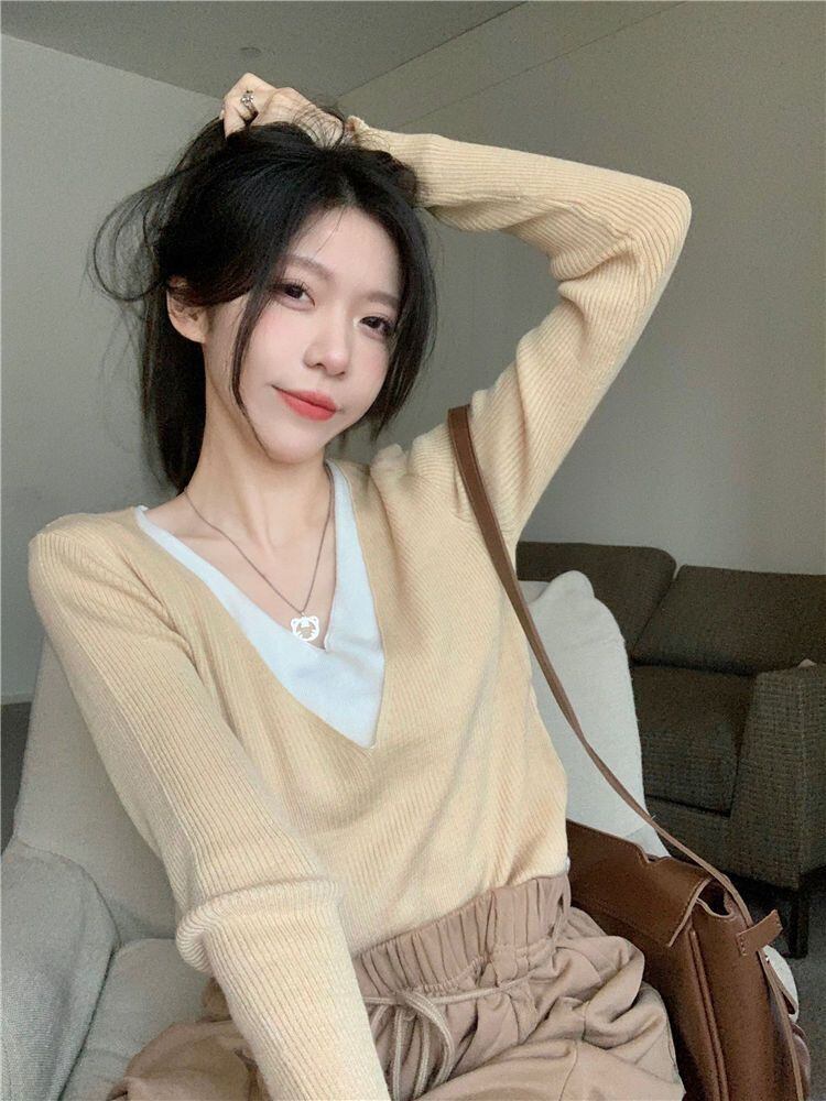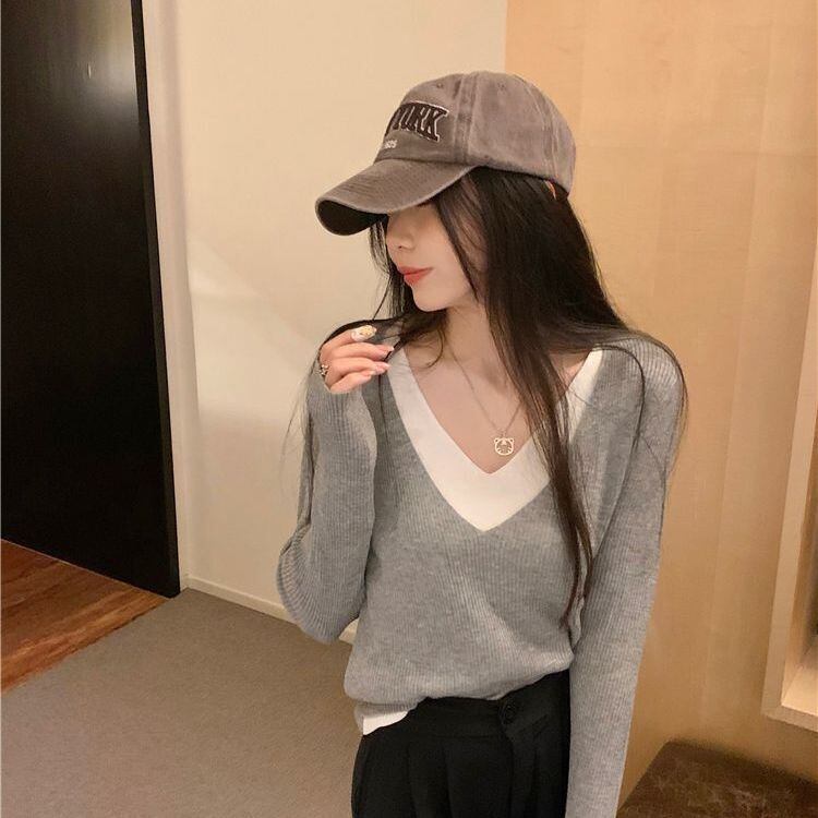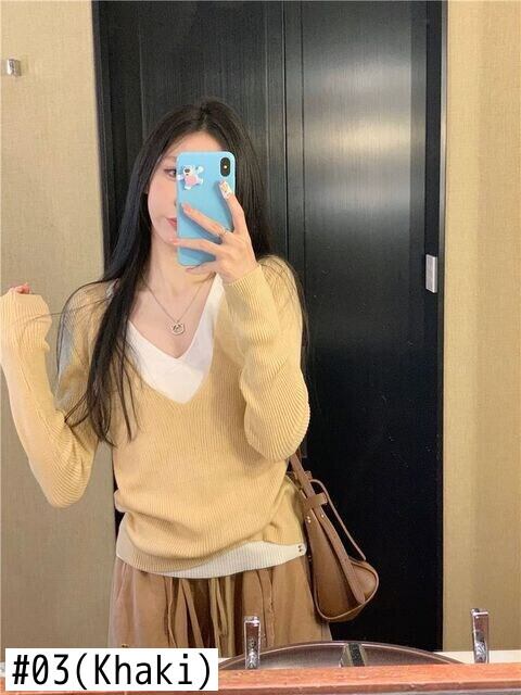 V ネックセンススリムフィットトップ偽ツーピースニットセーターシャツジャージセータープルトップス Vネック