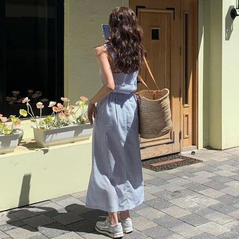 タンクセクシーキャミソールクロップトップスレースアップブルーストライプスカートレディース 2 ピースセットベスト Y2k ポケットシャツ