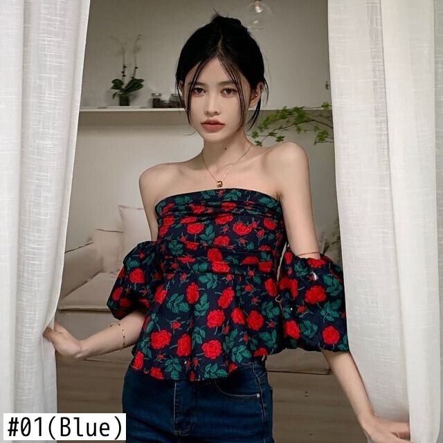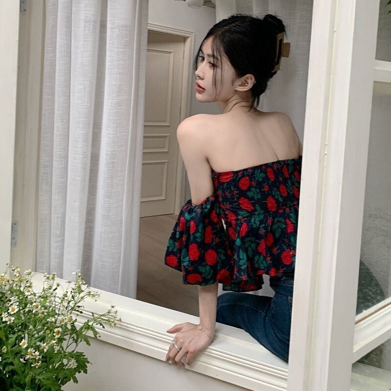 セクシーオフショルダーローズクロップトッププリントシャツ夏ショート花柄シャツ Blusa ブラウス サマー 夏物