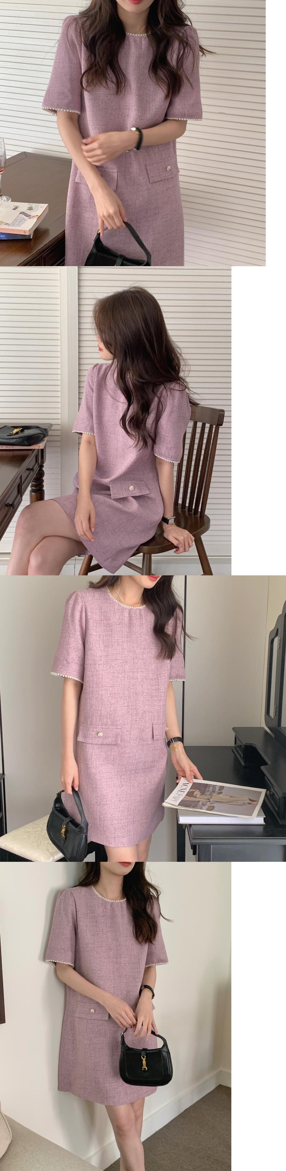 パールレトロストレートフレンチ気質ショートパープルツイードドレス夏 Vestido ローブ O ネックスリーブチェック柄ドレス サマー 夏物 Oネック 真珠