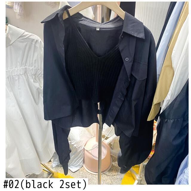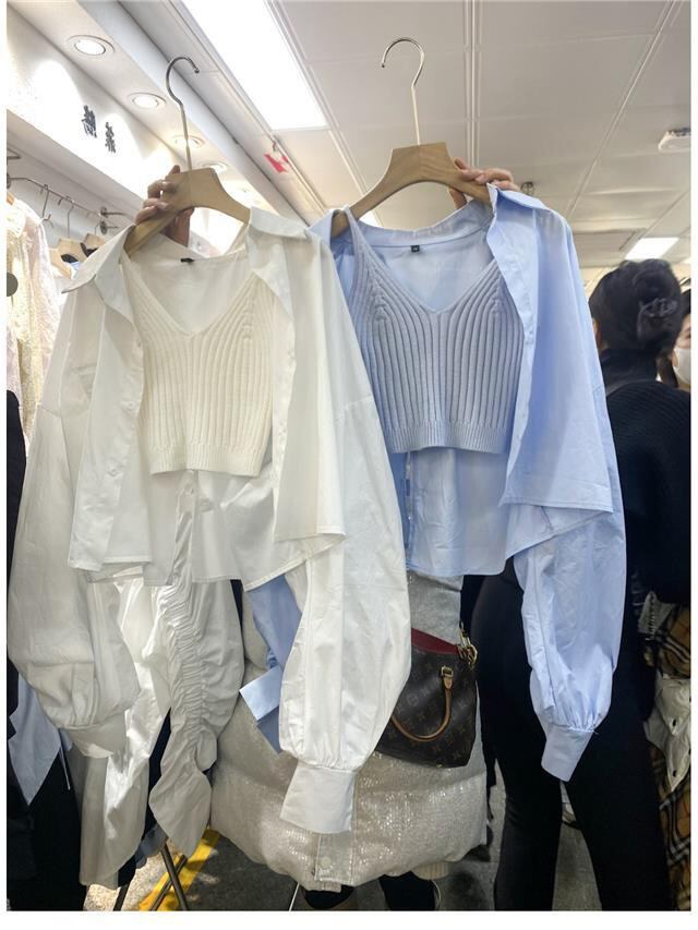 ニットキャミソールトップスシャツ 2 ピースセットタンク巾着白シャツ Roupas ブラウス ホワイト