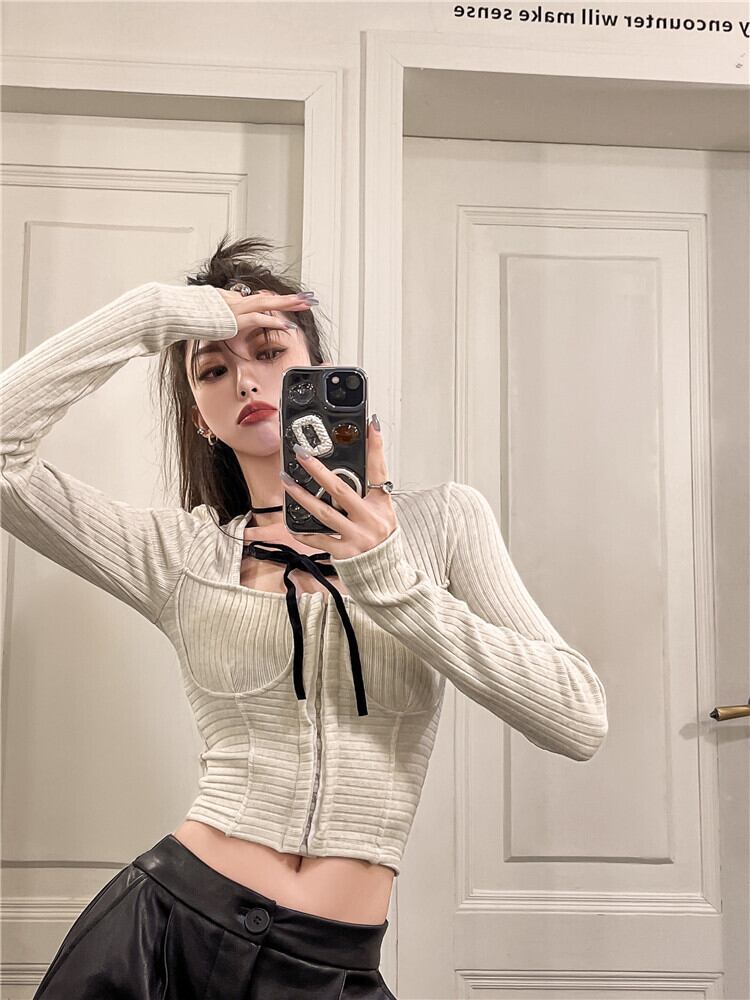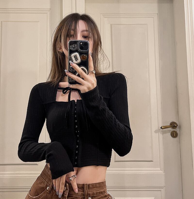 弓レースアップスクエアスリムスパイシー感覚ニッチ長袖シックニットシャツプル Y2k セーターブラックトップセーター ロング スクウェア