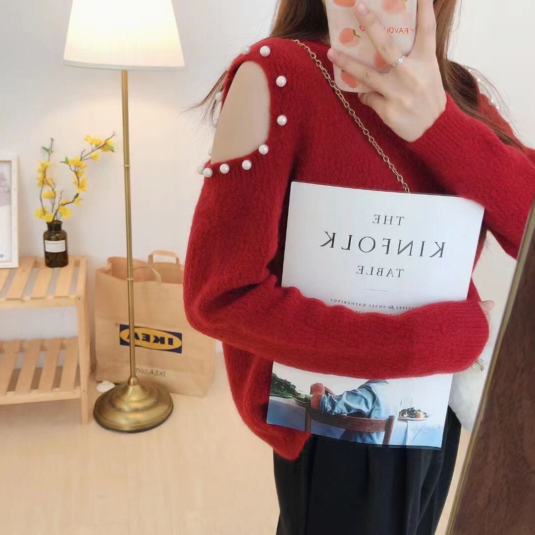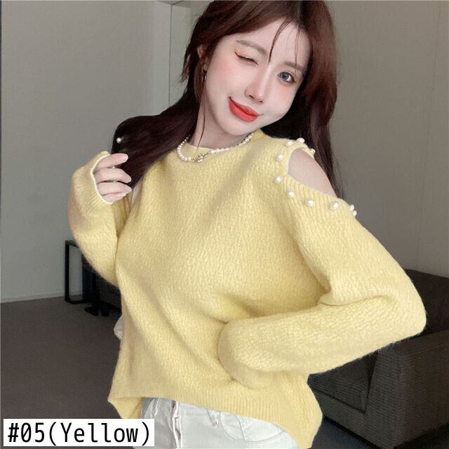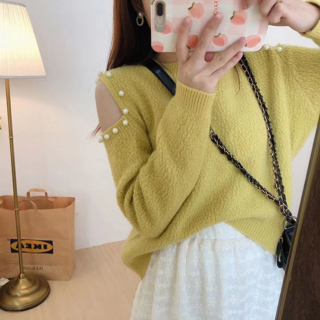 プルオーバー肩 O ネックセータージャンパースタイルニットビーズ Y2k トップス甘いグランジセーター 大人ガーリー スウィート キュート カジュアル Oネック
