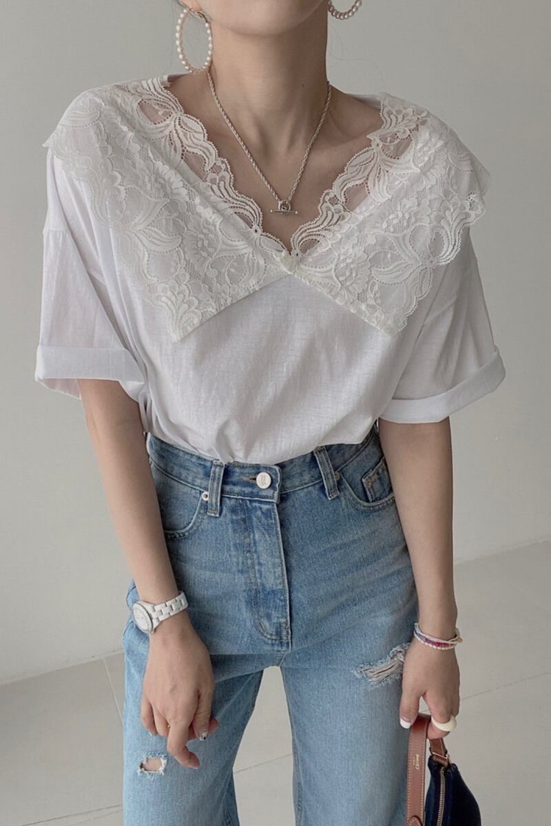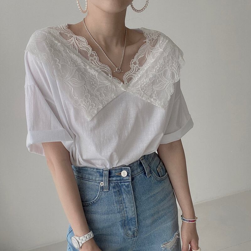 フリルルーズホワイトレースシャツ Y2k トップグラフィック Tシャツ半袖コットン Tシャツ Ropa Tシャツグランジ ショート ハーフスリーブ