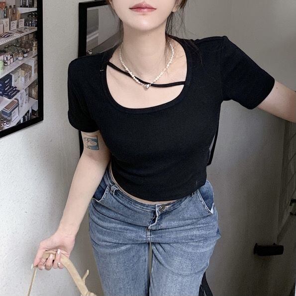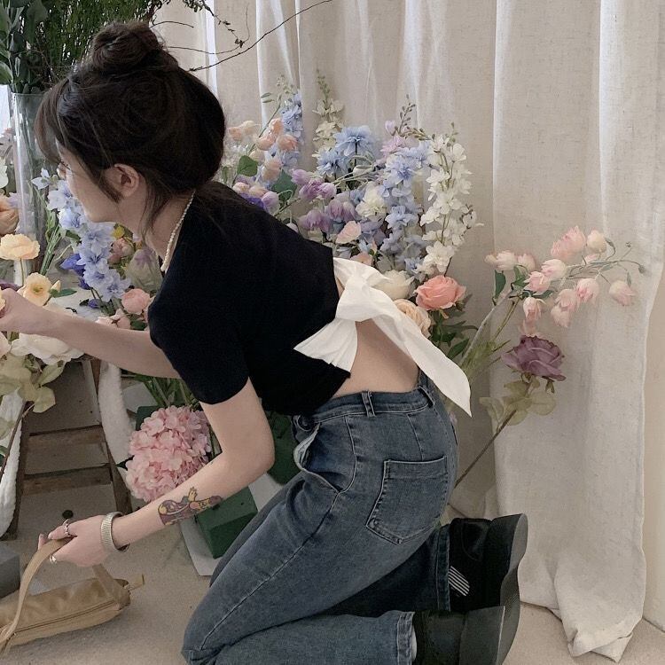 シャツバックリボンコットン Tシャツセクシークロップトップスグランジ Ropa Y2k グラフィック Tシャツ美的服黒 Tシャツ ブラック