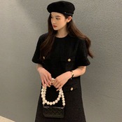 Vestidos De O ネックポケット半袖ブラックチェック柄ドレスミニツイードストレートハーフルーズ Y2k 夏 ショート ハーフスリーブ サマー 夏物 Oネック