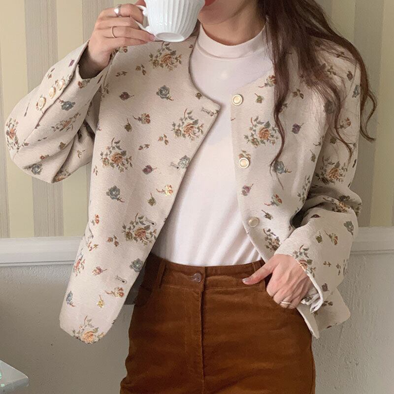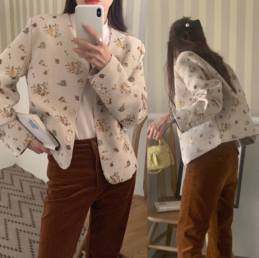 テーラードコート チャケータ 冬ジャケット O ネック刺繍花ルーズフィット長袖コート ロング レッド ウィンター 冬物 花柄 Oネック