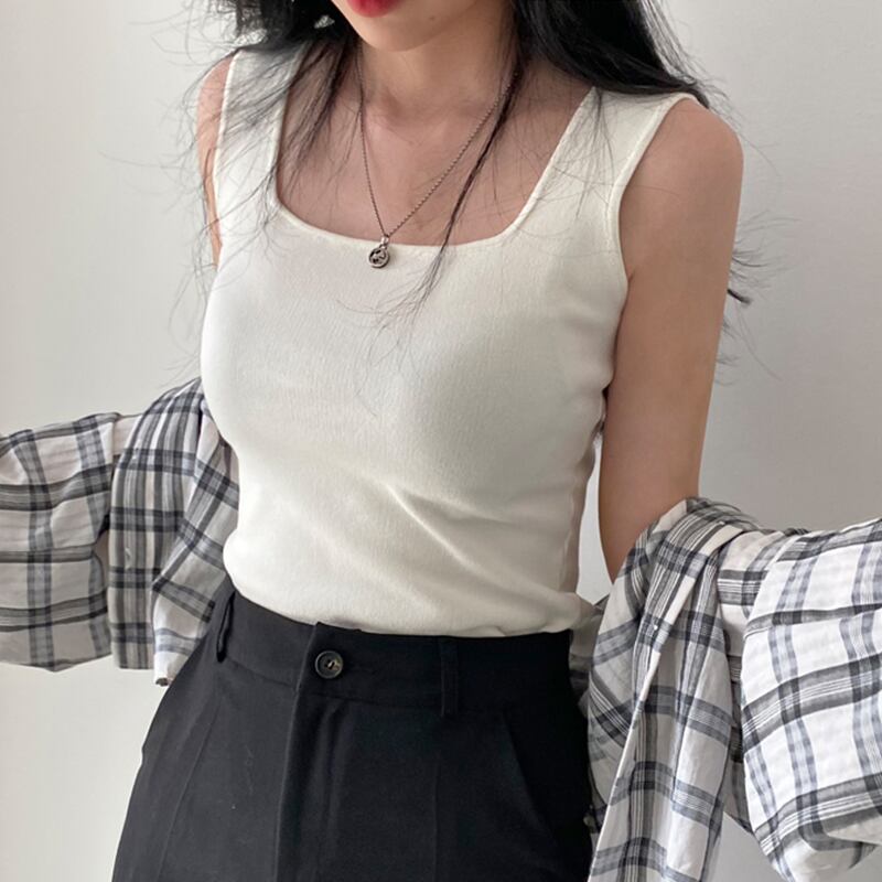 タンクキャミソールスクエアスリムフィットソリッドカラーホワイトノースリーブクロップトップニット Tシャツセクシー Tシャツ Ropa スクウェア