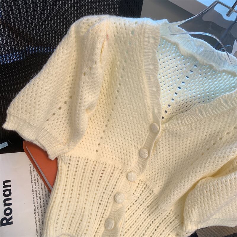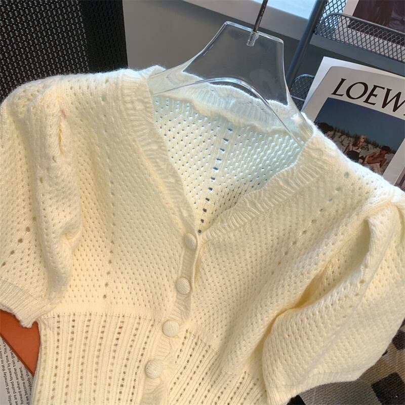 ピンクアイストップニットカーディガン夏バブル半袖 Tシャツセータークロップドカーディガン Y2k セーター ショート ハーフスリーブ サマー 夏物 シルク