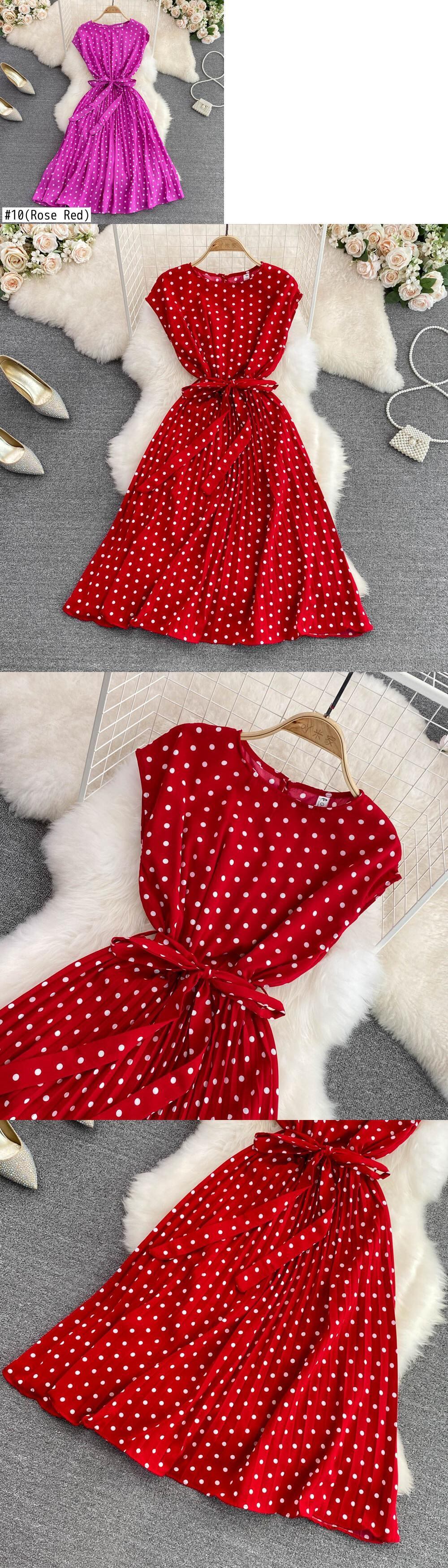 ボディコンローブ Vestidos デラウンドネックノースリーブウエストタイアップリボン A ラインレッドプリーツポルカドットドレス Oネック Aライン