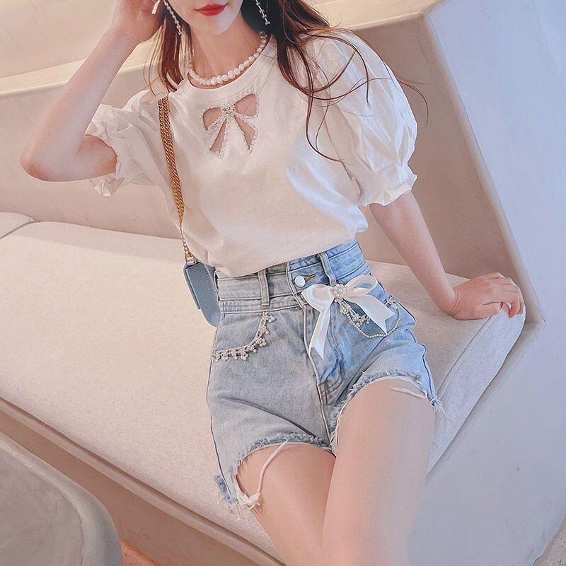 ホワイトコットン半袖 Tシャツ Ropa Y2k 服 Tシャツ半袖ニッチ美的グラフィック Tシャツグランジビーズ ショート ハーフスリーブ
