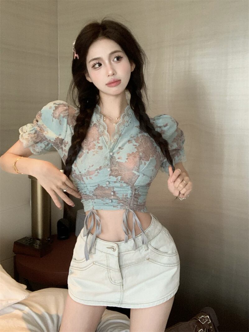 夏パフトップス半袖シャツタイト巾着シック V ネックレースシャツ花柄ブルーサブラウス ショート ハーフスリーブ プリント サマー 夏物 Vネック